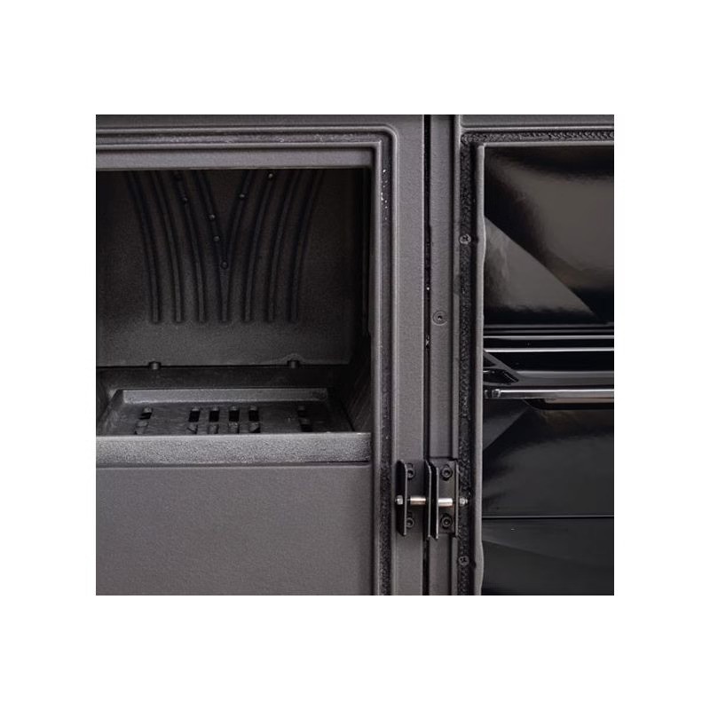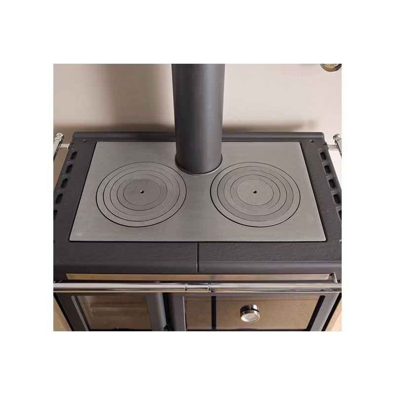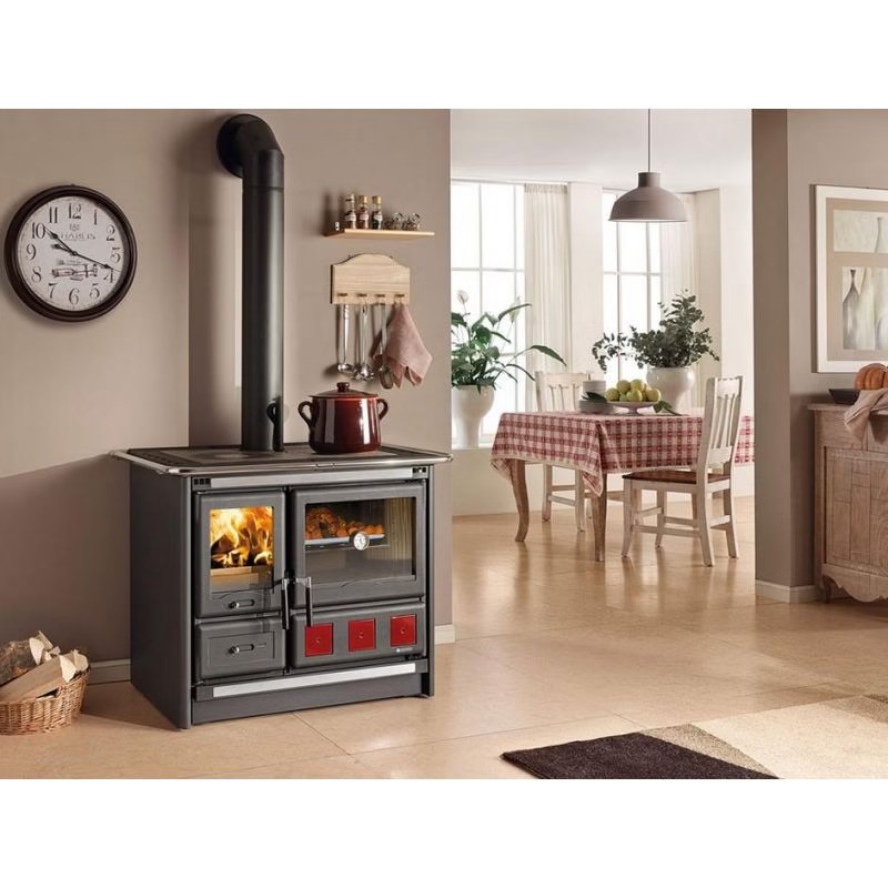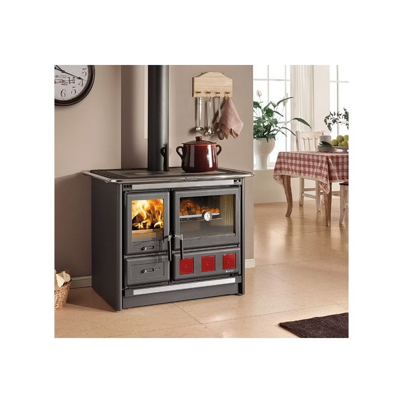 La struttura in acciaio e ghisa garantisce robustezza e un’ottima capacità di accumulo del calore. La porta del focolare, dotata di vetro ceramico doppio, offre sicurezza e una splendida visione della fiamma. Il forno di grande capacità, 78 L in acciaio smaltato, permette di cucinare in modo uniforme, esaltando i sapori autentici della cottura a legna.