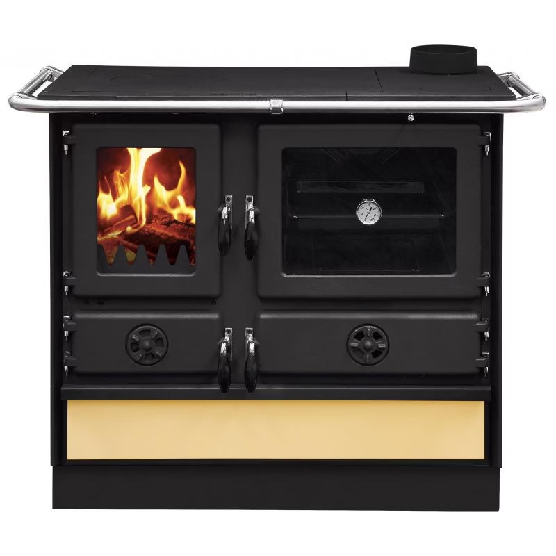 La stufa offre flessibilità di installazione grazie alla doppia uscita fumi (posteriore o superiore destra). Include anche un pratico vano porta-legna e un tabella forno per una maggiore praticità in cucina.