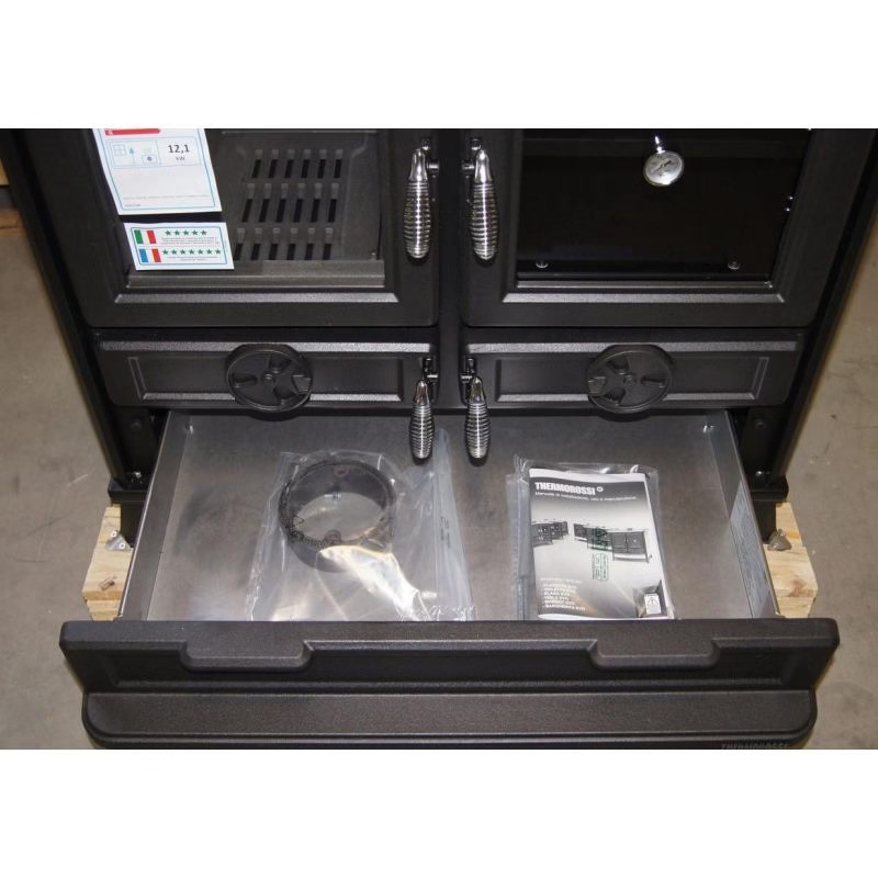 | Accessori inclusi | Forno con termometro, piastra in ferro con anelli, cassetto cenere, vano legna, barra frontale |