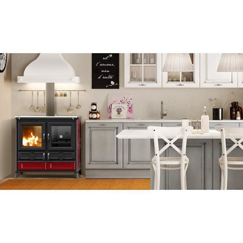 Tra le dotazioni utili per l’uso quotidiano troviamo anche un vano scalda-piatti, una cassetta raccogli-cenere, un cassetto porta-legna e una barra frontale. La struttura in ghisa e acciaio garantisce un’eccellente durabilità e un’ottima capacità di accumulo del calore, mentre la porta del forno con vetro ceramico resistente fino a 750 °C assicura sicurezza e un’estetica ricercata.