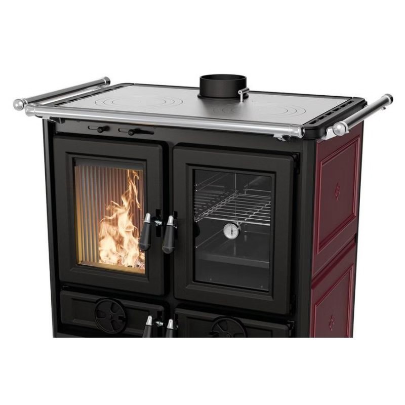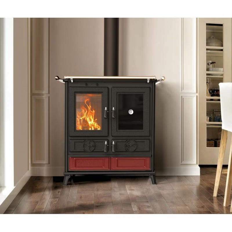 Tra le dotazioni pratiche per l’uso quotidiano troviamo il vano scalda-piatti, il cassetto porta-legna, il cassetto raccogli-cenere e la barra frontale di appoggio. Il sistema di regolazione dell’aria primaria, secondaria e terziaria garantisce una combustione ottimale e un rendimento dell’87,4 %, con consumi contenuti di legna.